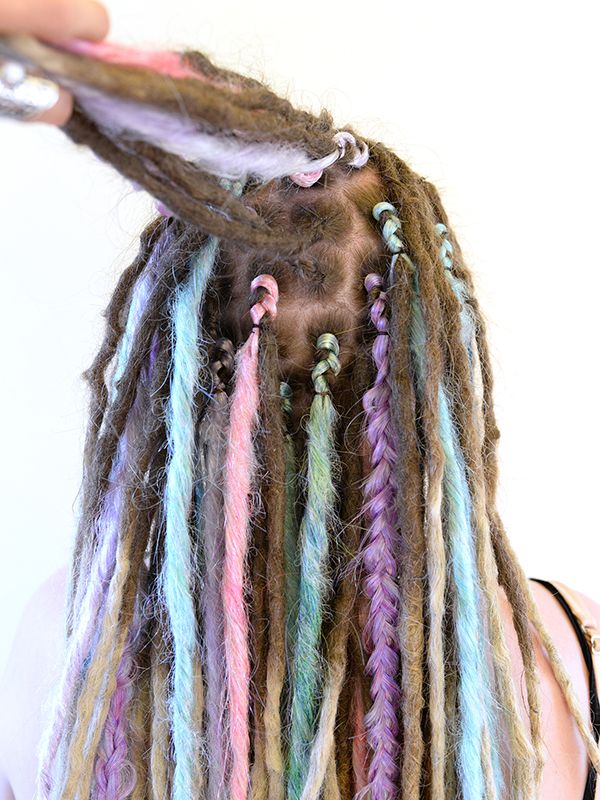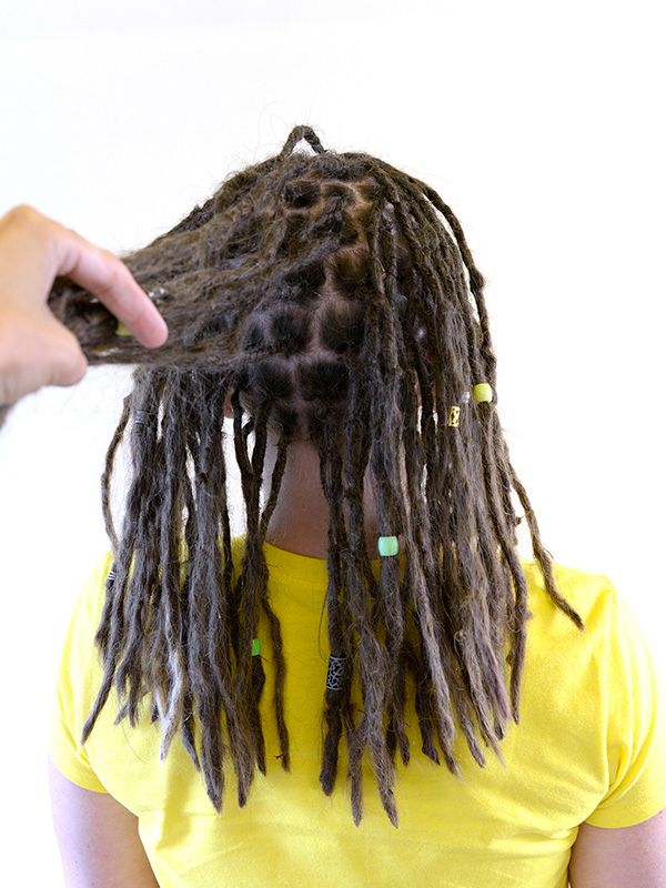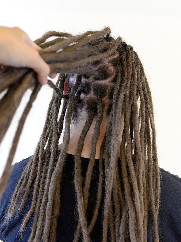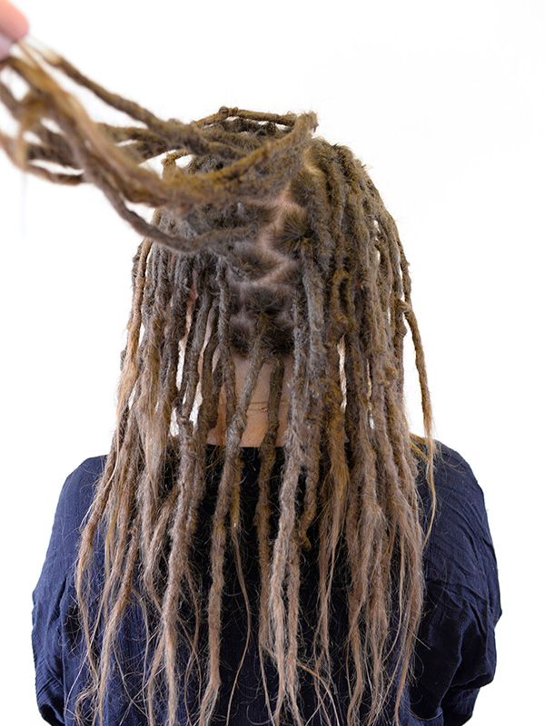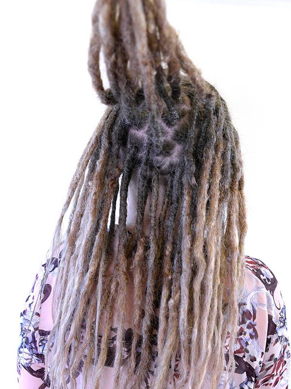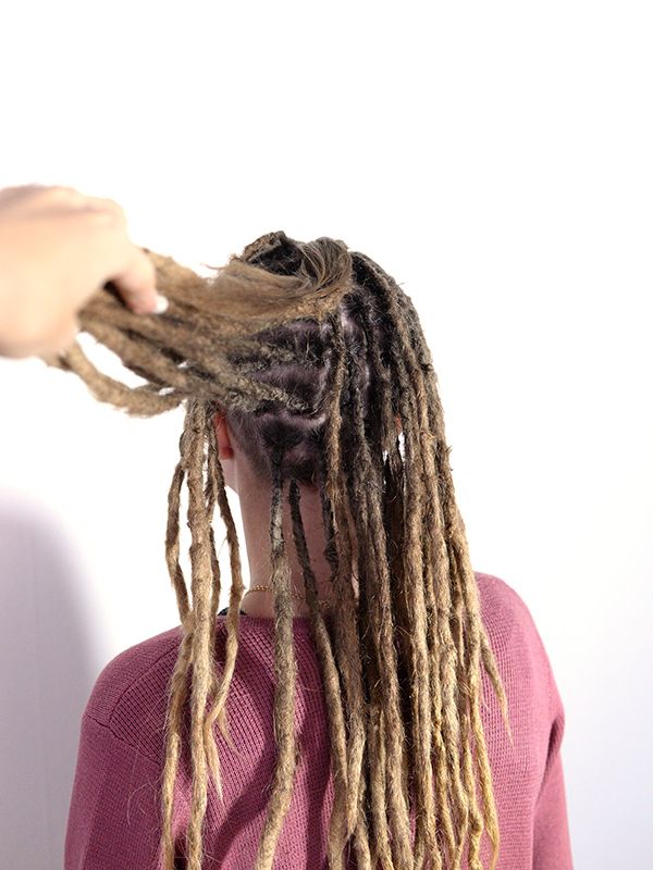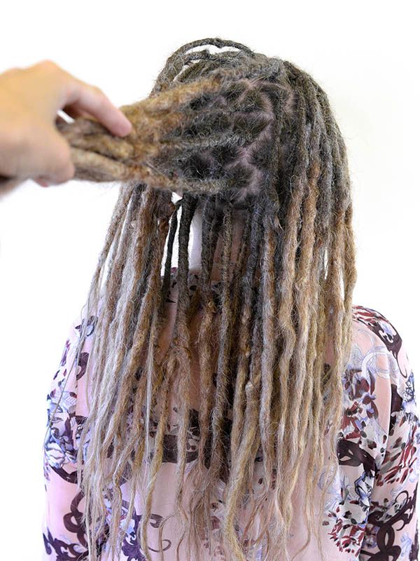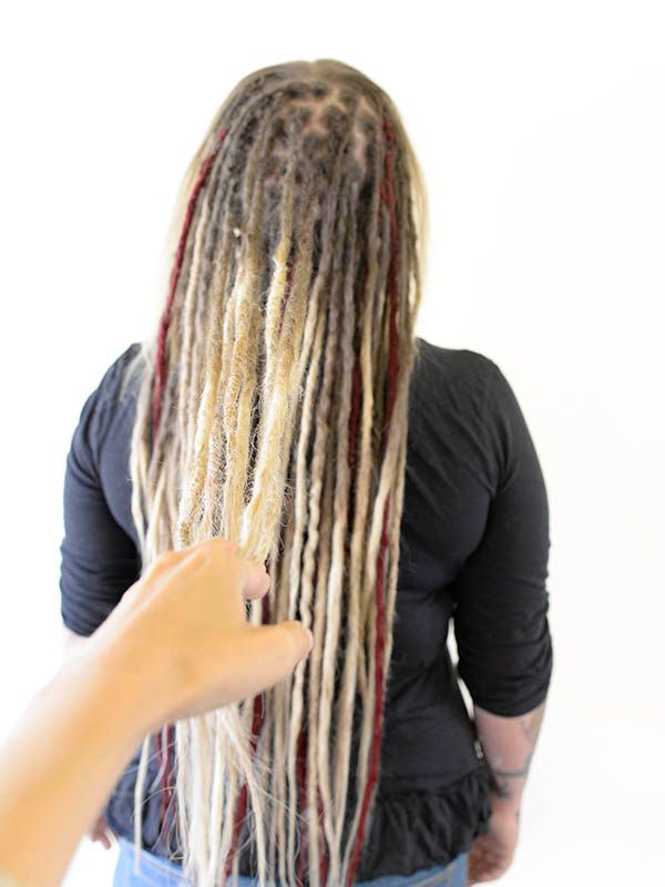 Jag börjar med att dela upp ditt hår och ser till att dreadsen är separerade, sedan tuperar jag din utväxt och ser till att alla dina småhår går in i rätt dreadlock, jag knyter därefter en syntet-fibertråd runt din dreadlock i roten av dreaden.