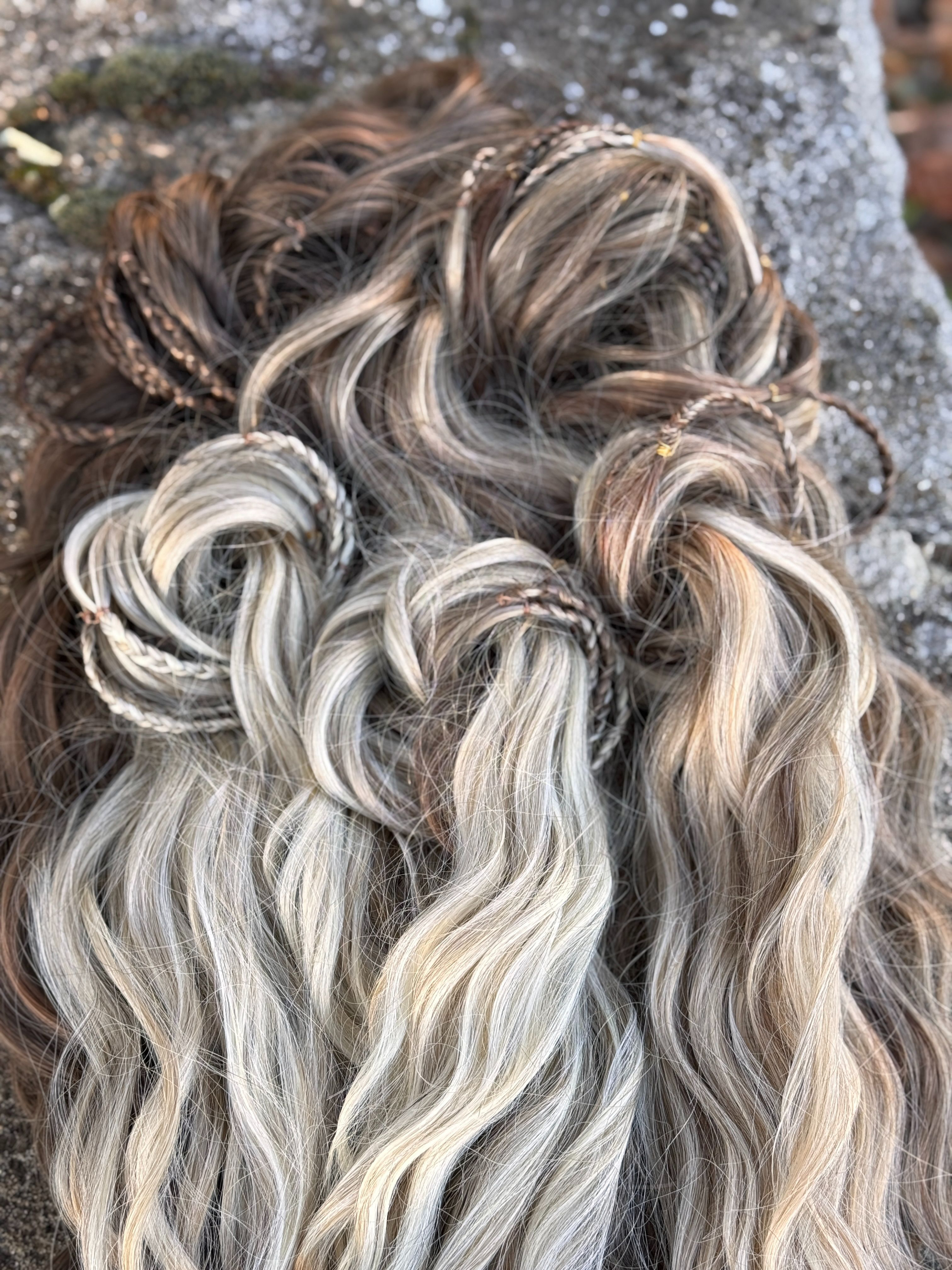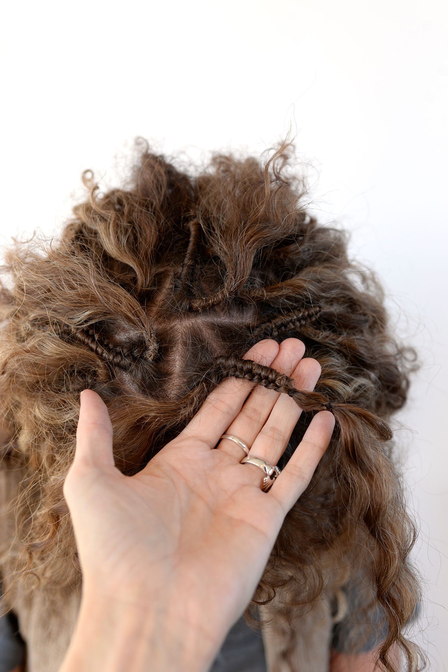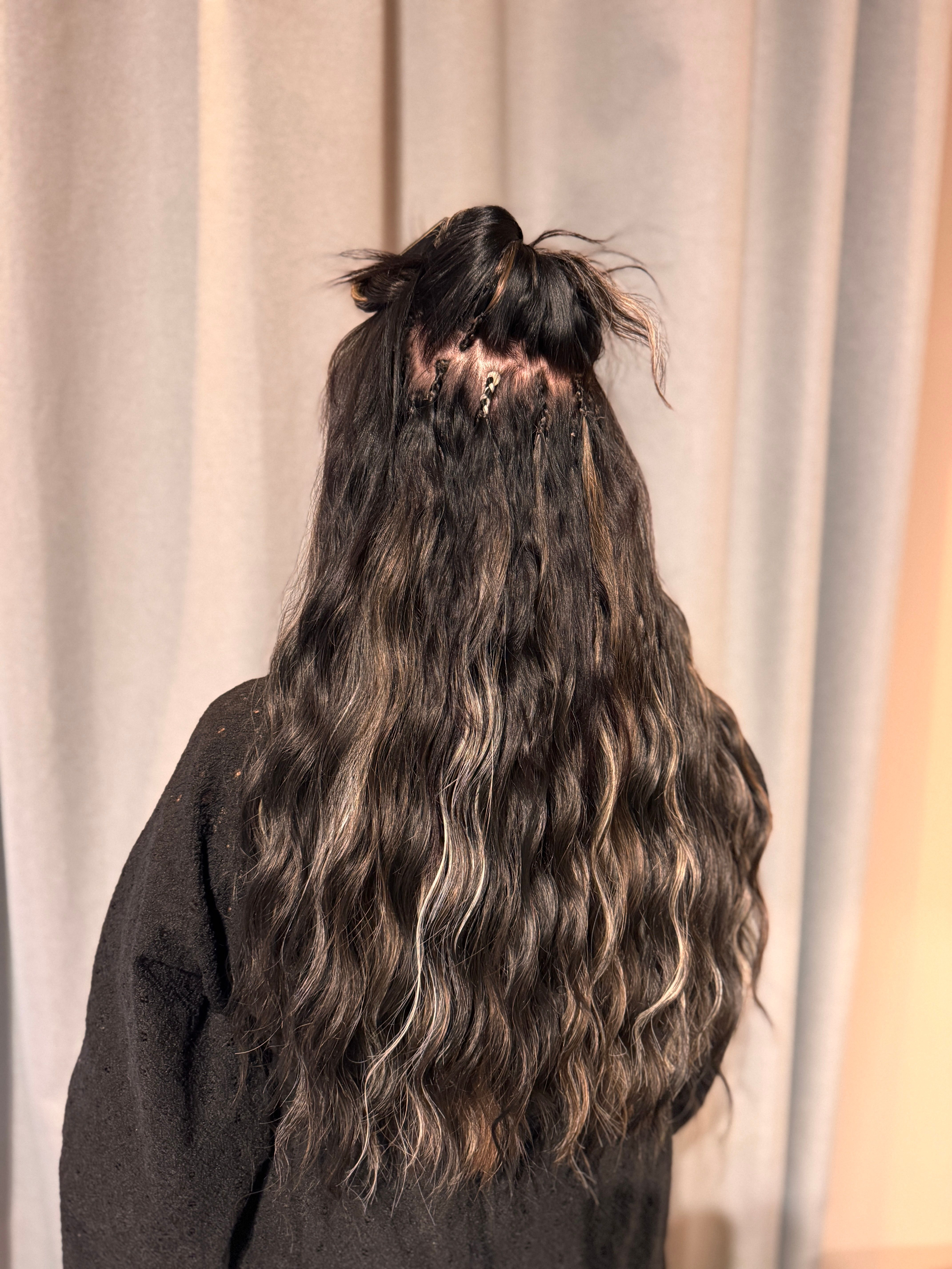 Jag tar en del av ditt egna hår och en del löshår och flätar en ca 2 cm lång fläta, den fästs sedan med en syntet-fibertråd. Denna fläta skadar ej ditt egna hår.