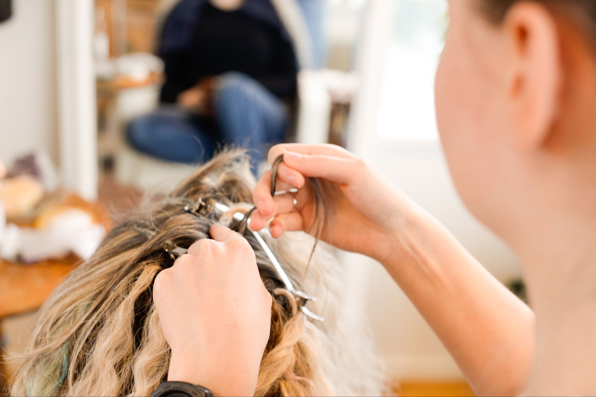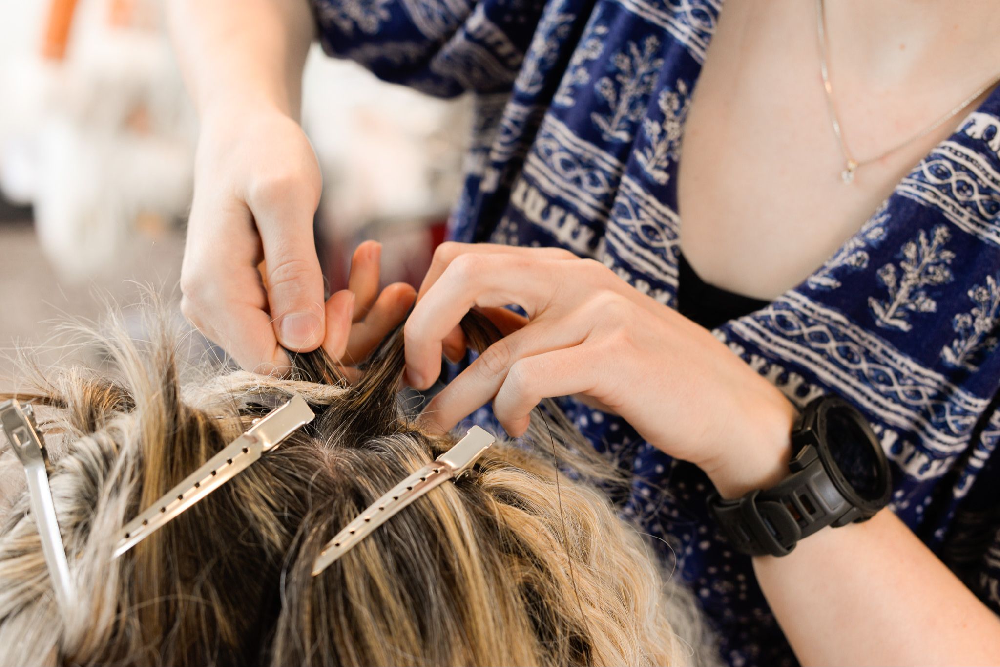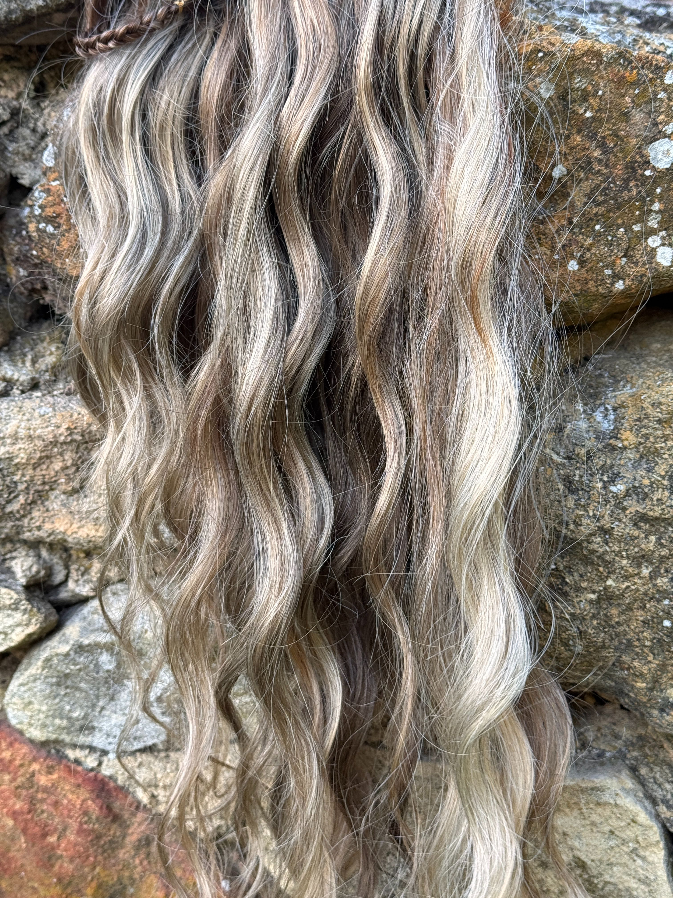 Jag tar en del av ditt egna hår och en del löshår och flätar en ca 2 cm lång fläta, den fästs sedan med en syntet-fibertråd. Denna fläta skadar ej ditt egna hår.