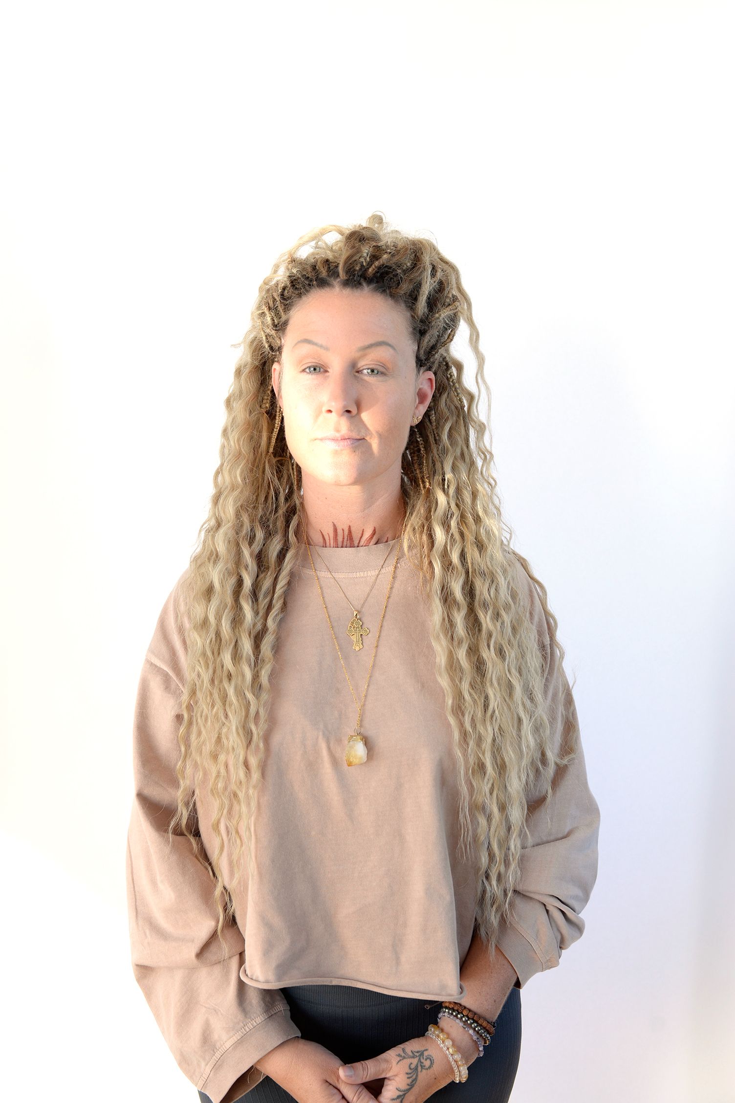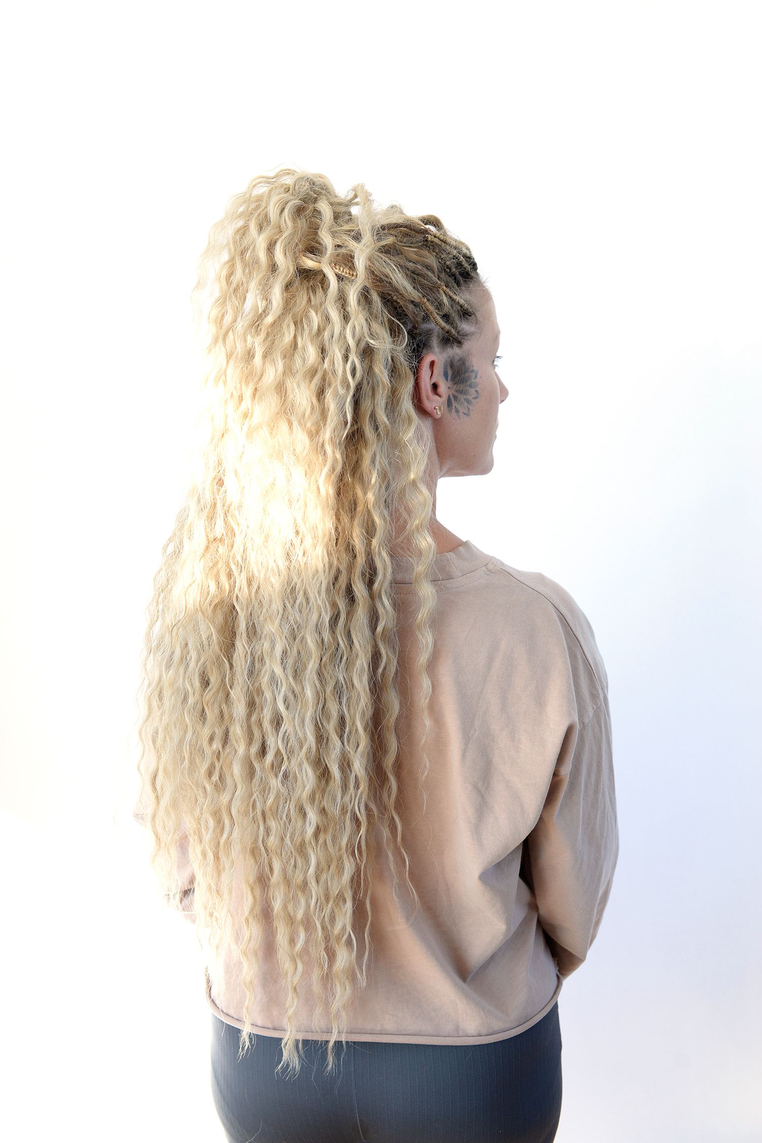 Ditt egna hår hänger löst vid sidan om syntet-dreadsen.