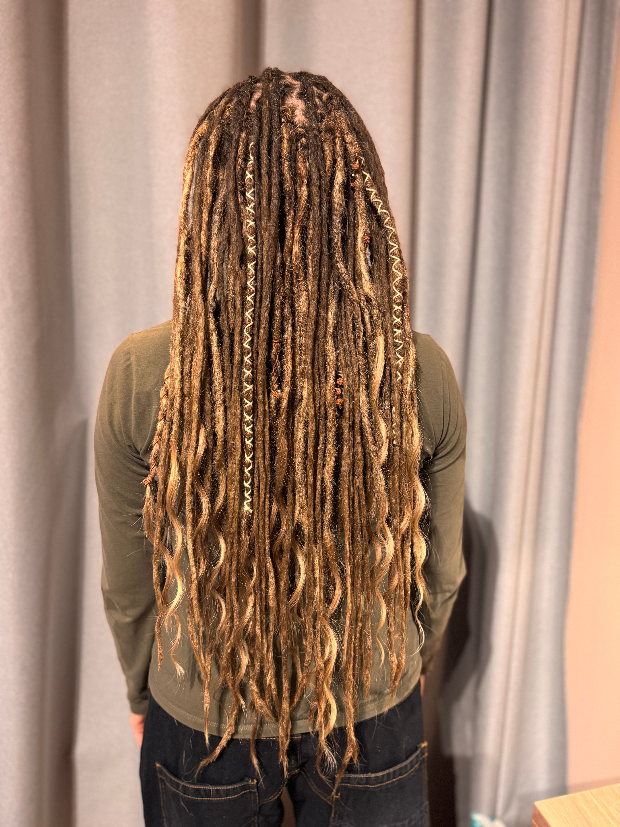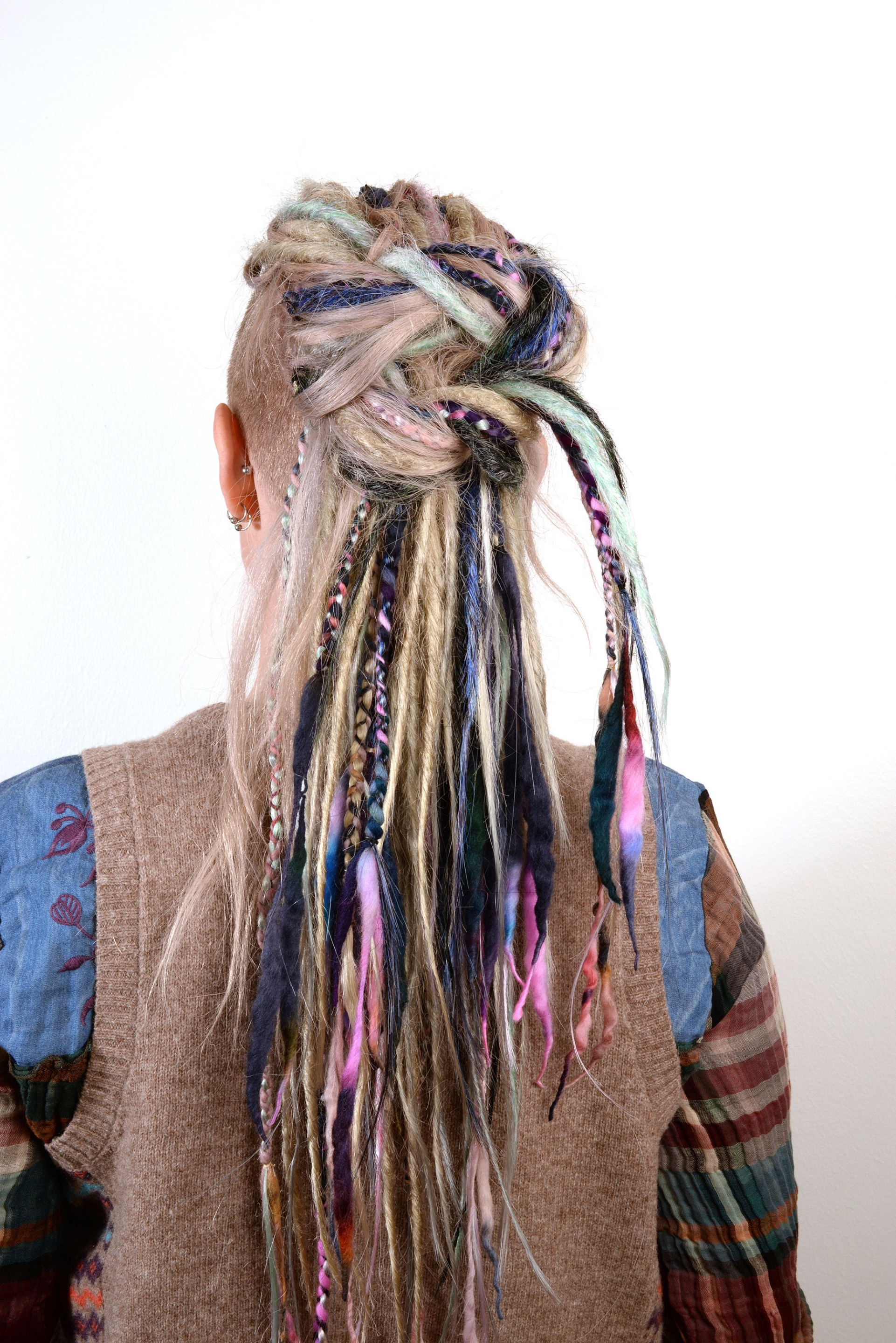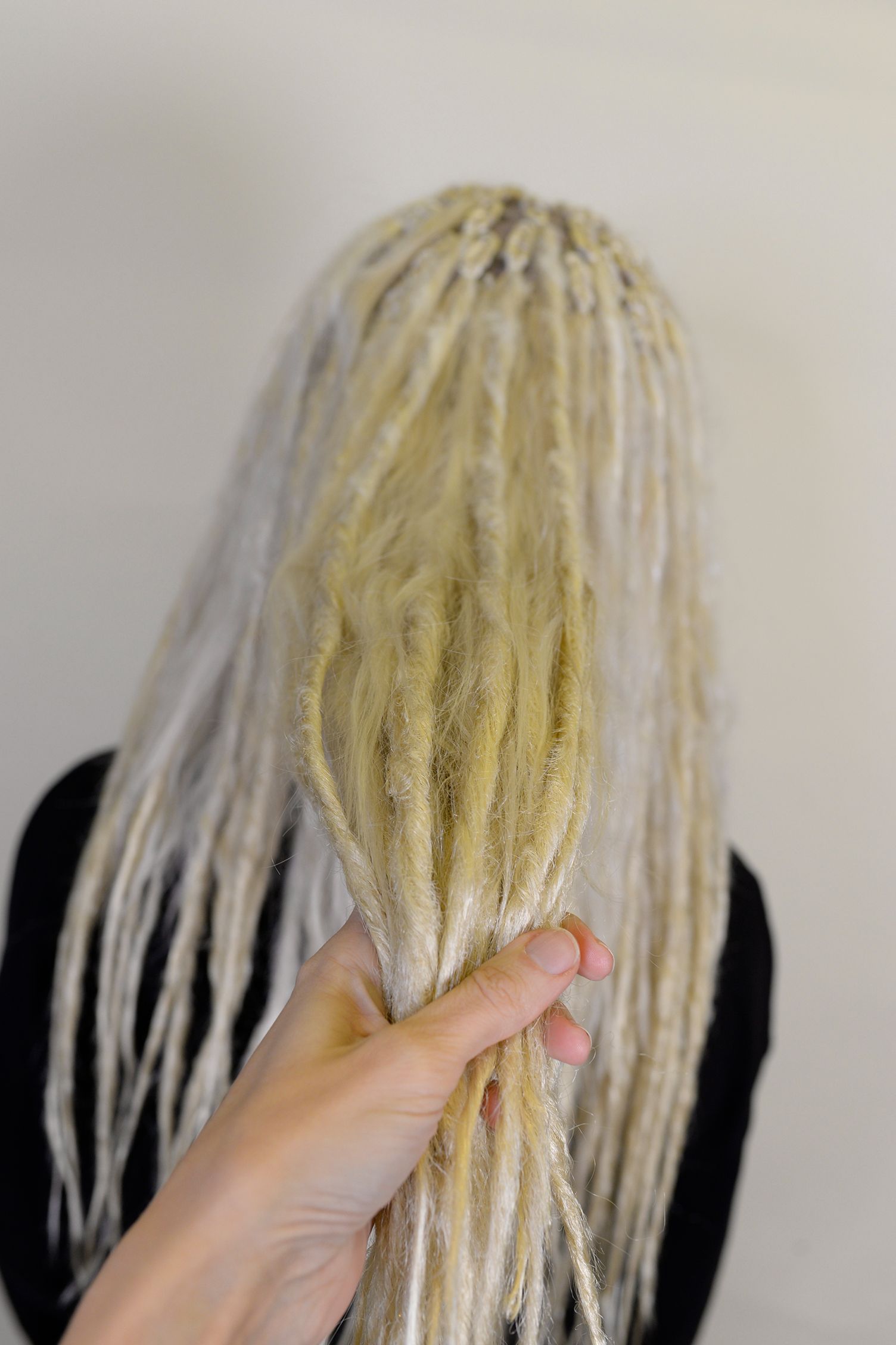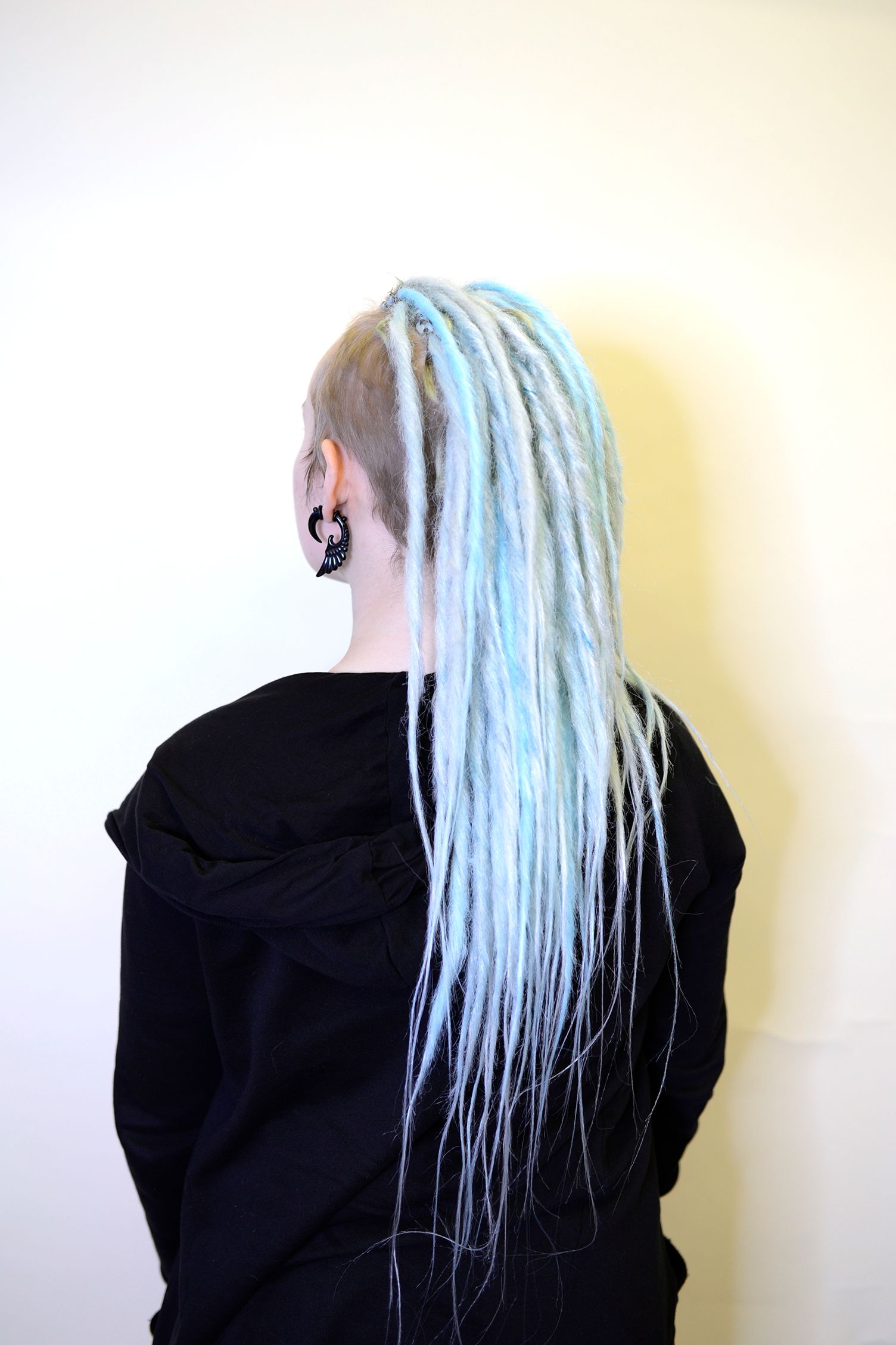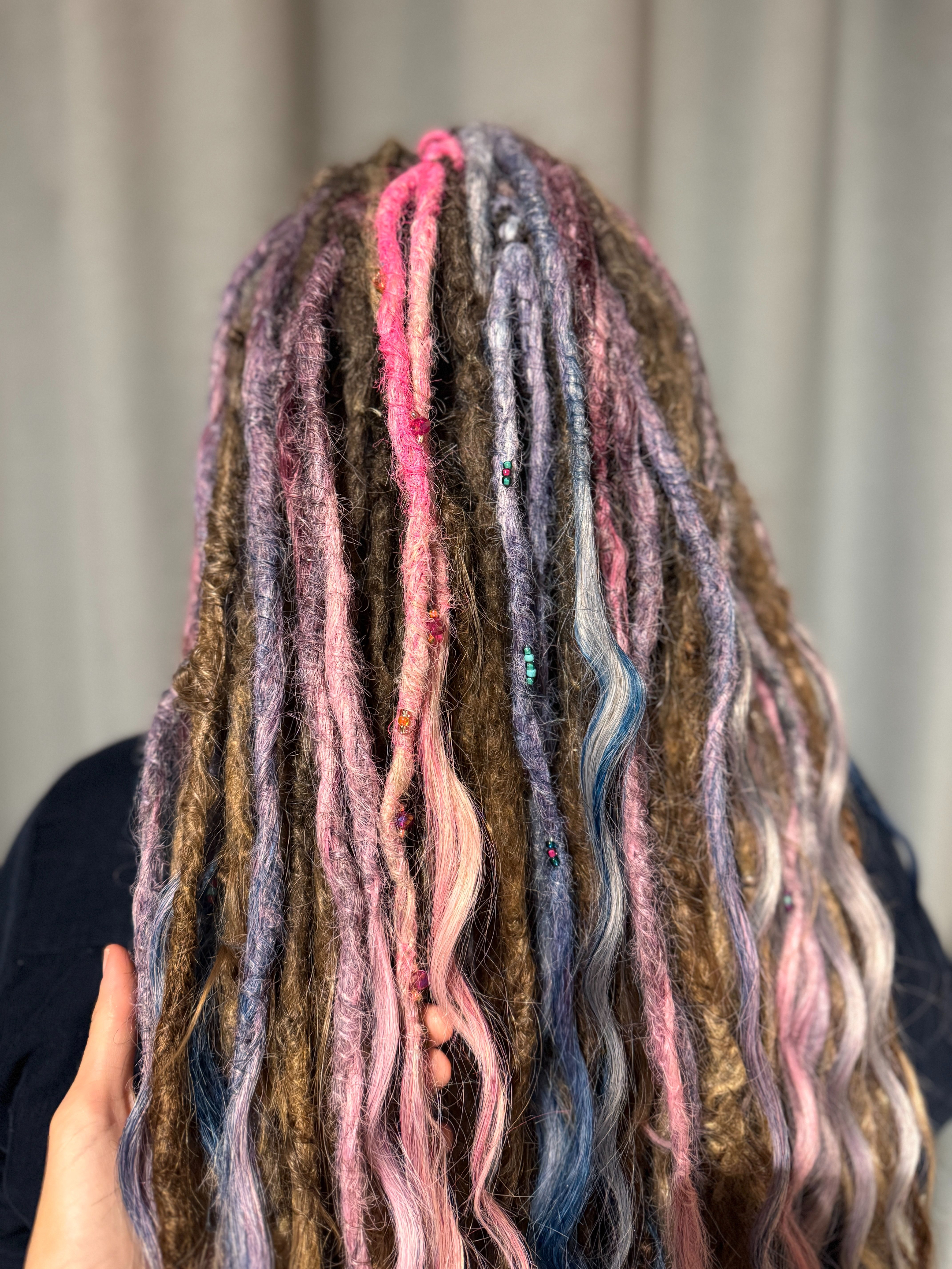 Jag gör bĂ„de pre made dreadlocks som single ended dreads och double ended dreadlocks som man kan flĂ€ta in med olika metoder, du kan vĂ€lja, vilken typ av textur dreadsen ska ha och vilka fĂ€rger och hur du vill att slutet ska vara pĂ„ dreadsen som text dreadlocks med lösa toppar som Ă€ven kallas för Mermaid dreadlocks.Â