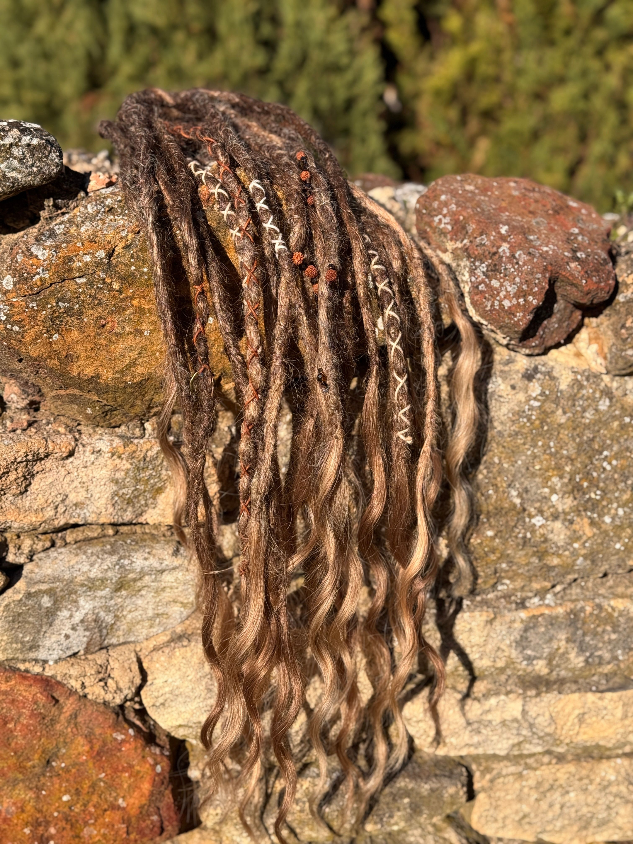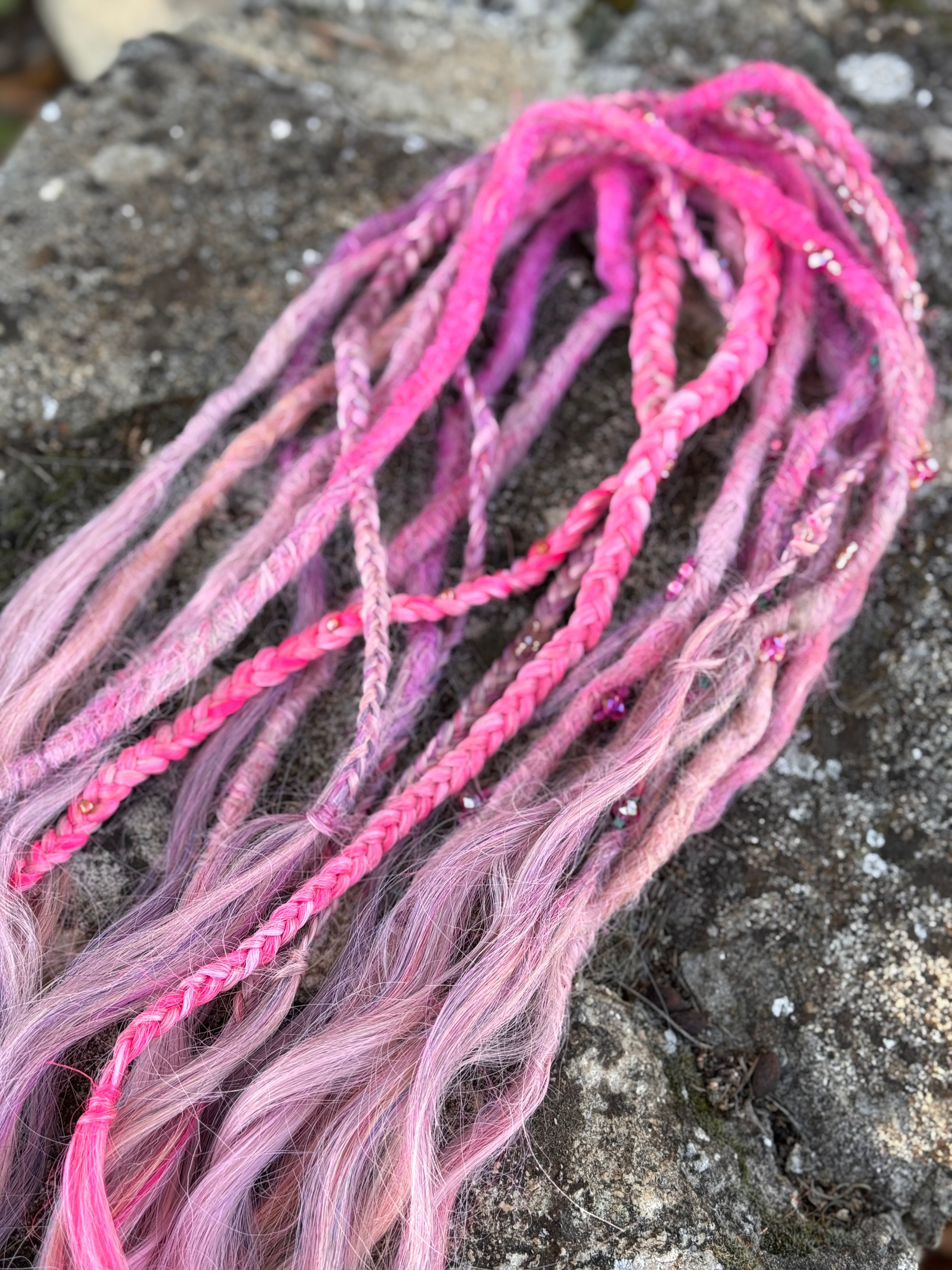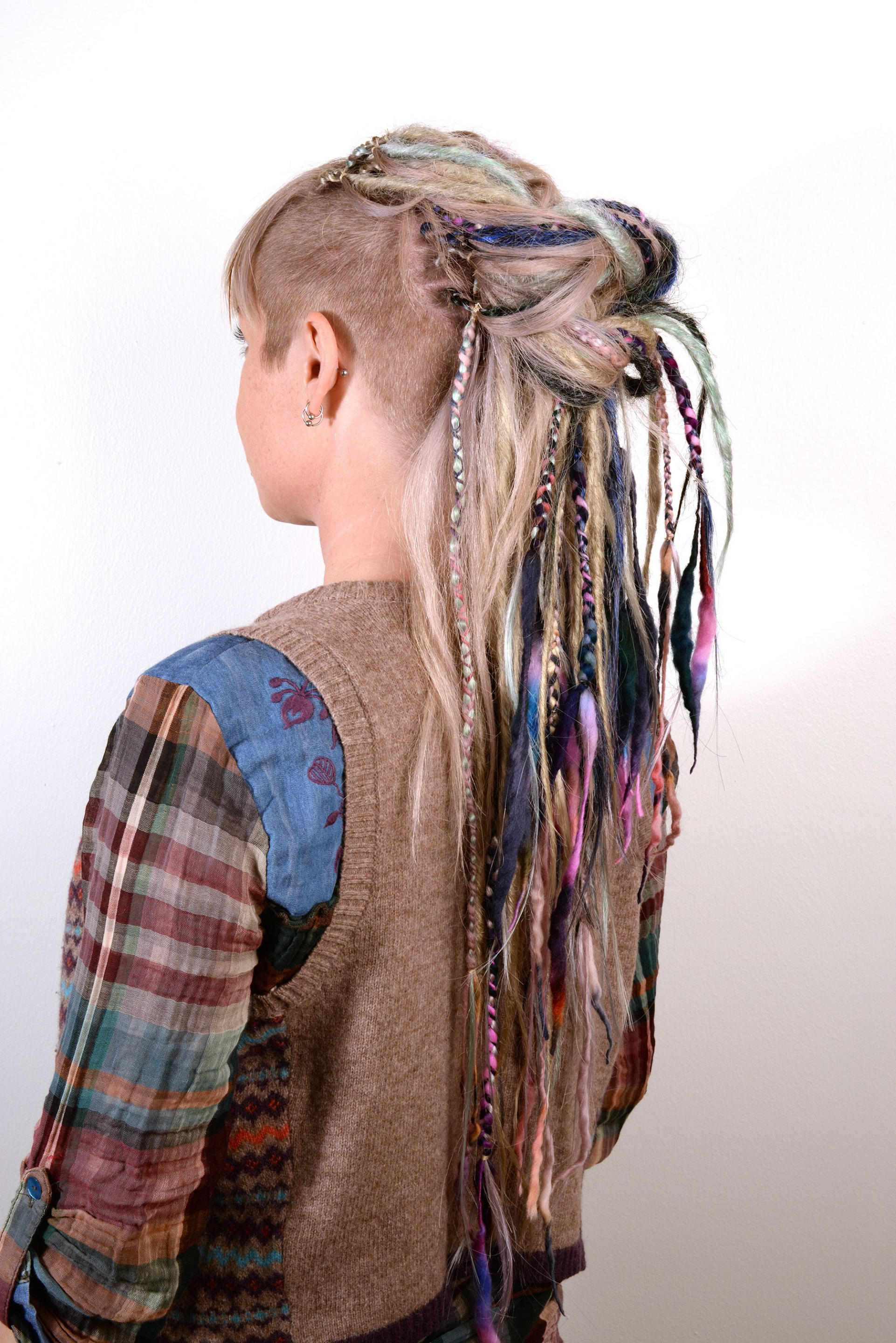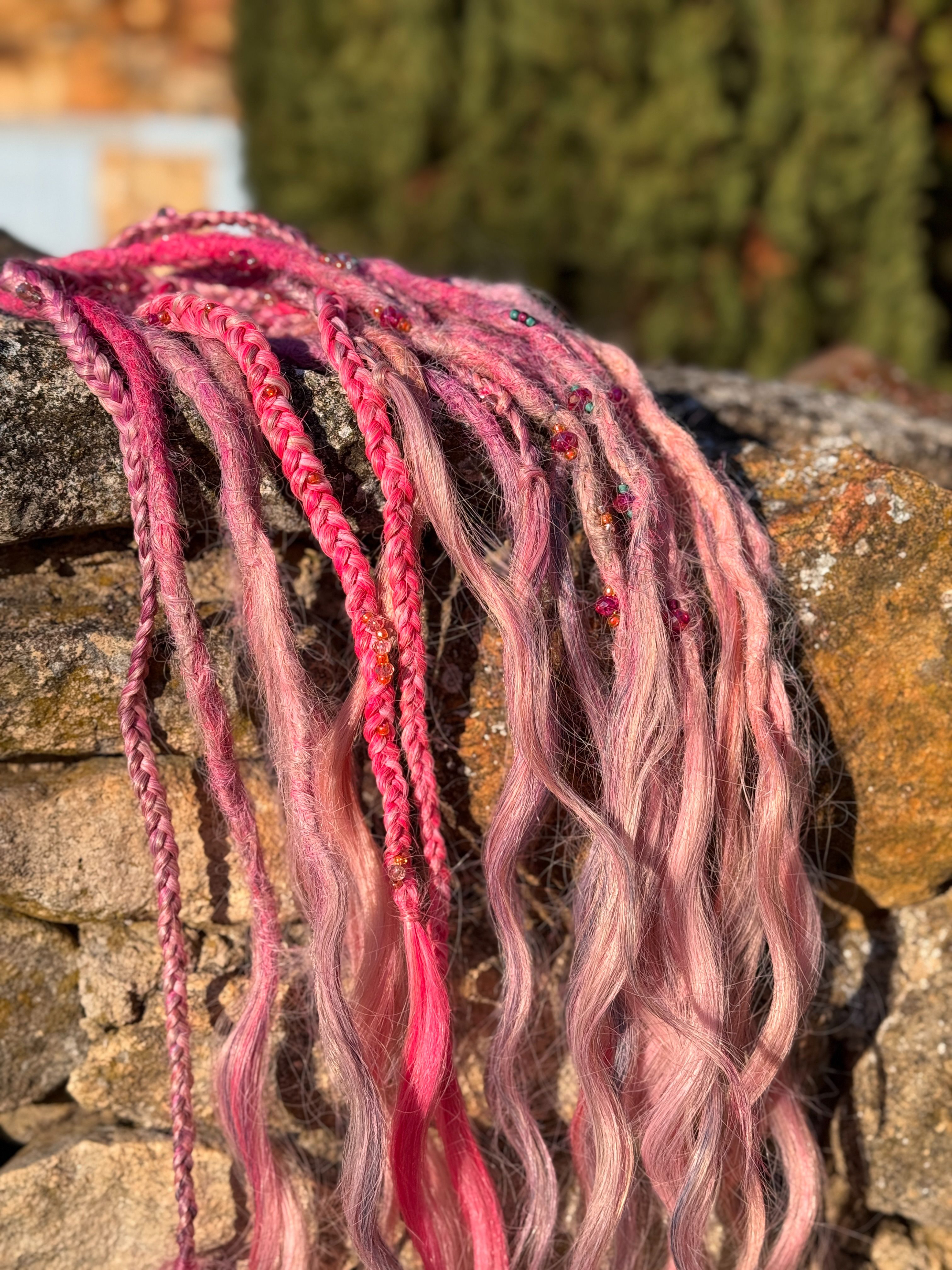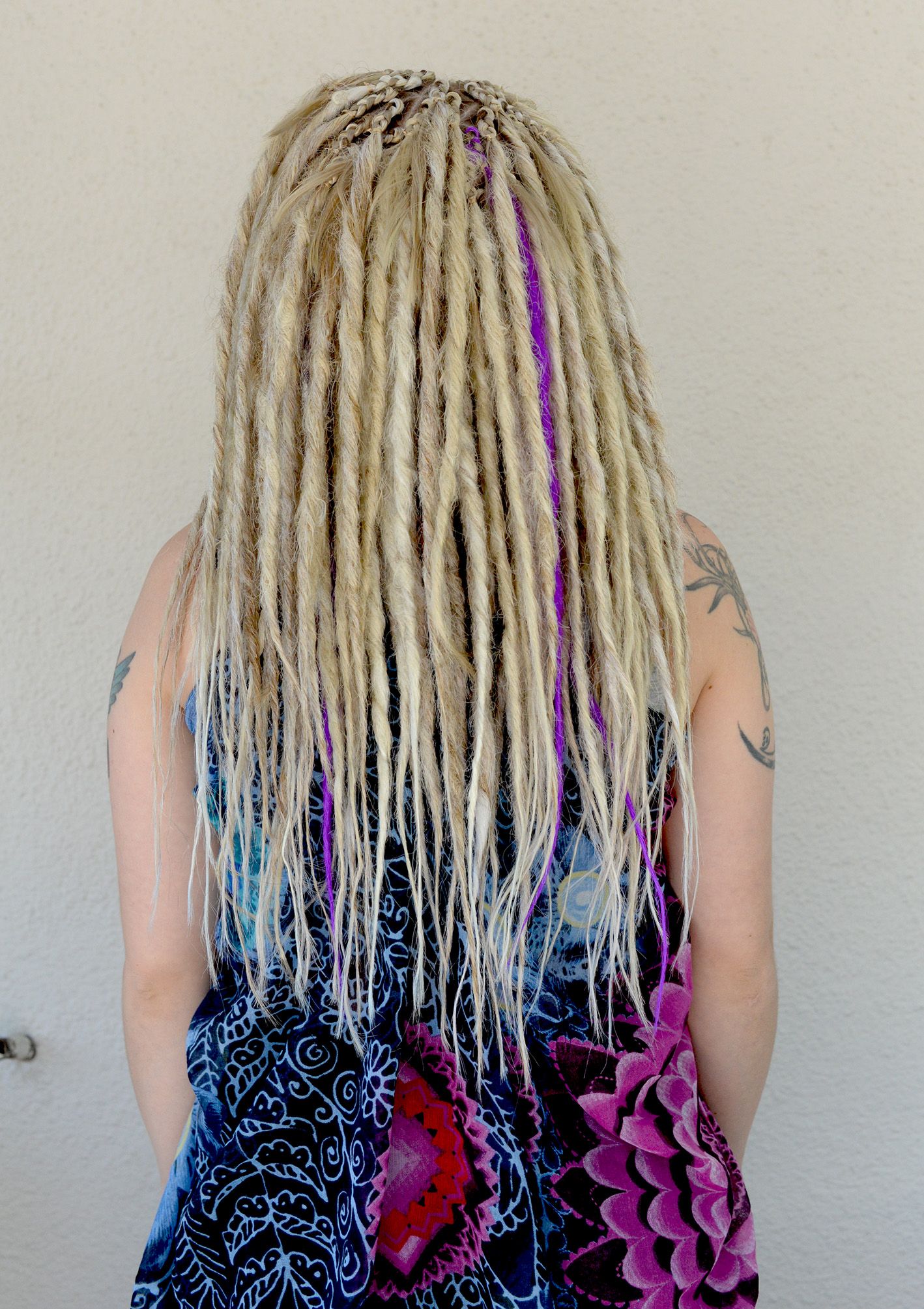 Jag gör bĂ„de pre made dreadlocks som single ended dreads och double ended dreadlocks som man kan flĂ€ta in med olika metoder, du kan vĂ€lja, vilken typ av textur dreadsen ska ha och vilka fĂ€rger och hur du vill att slutet ska vara pĂ„ dreadsen som text dreadlocks med lösa toppar som Ă€ven kallas för Mermaid dreadlocks.Â