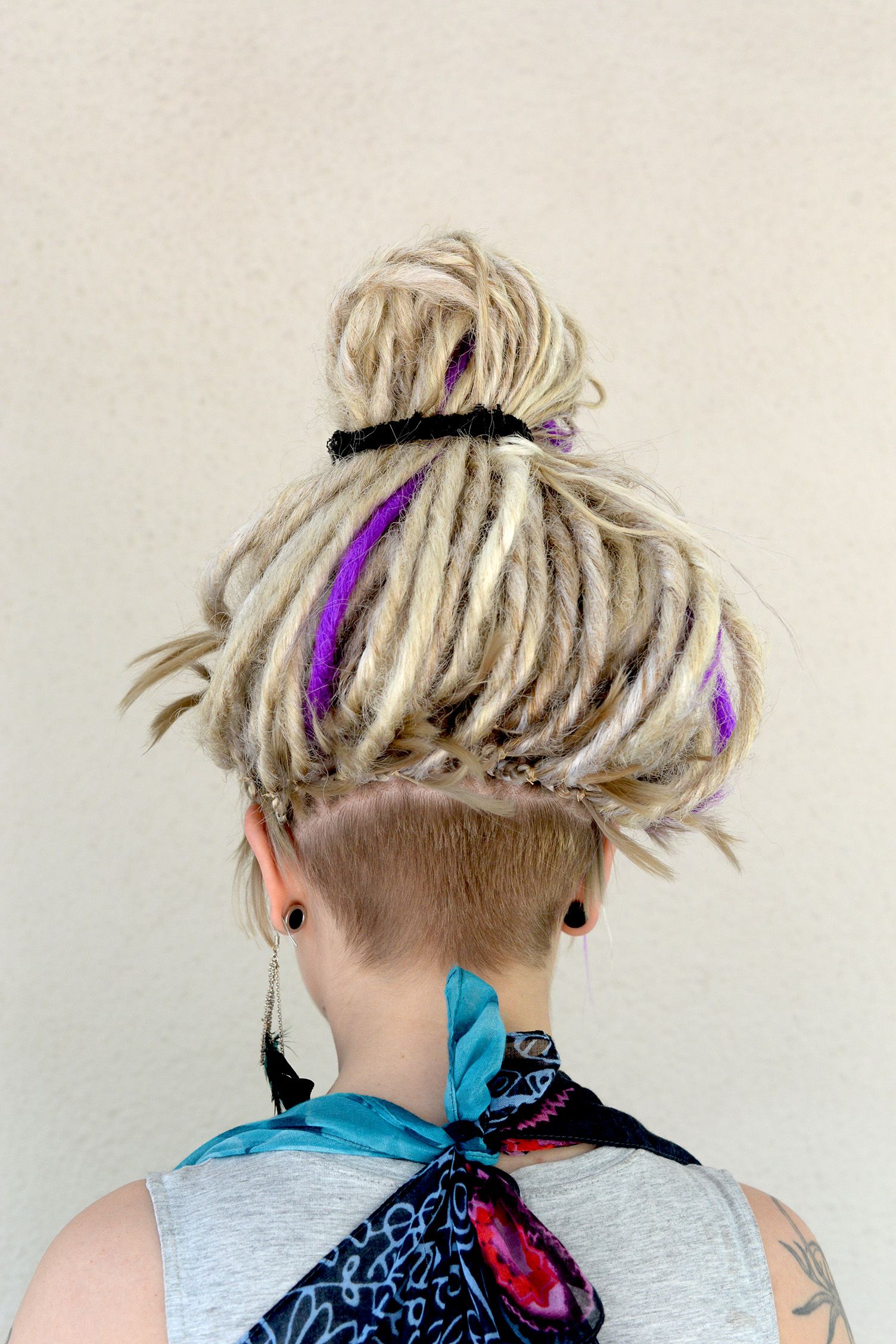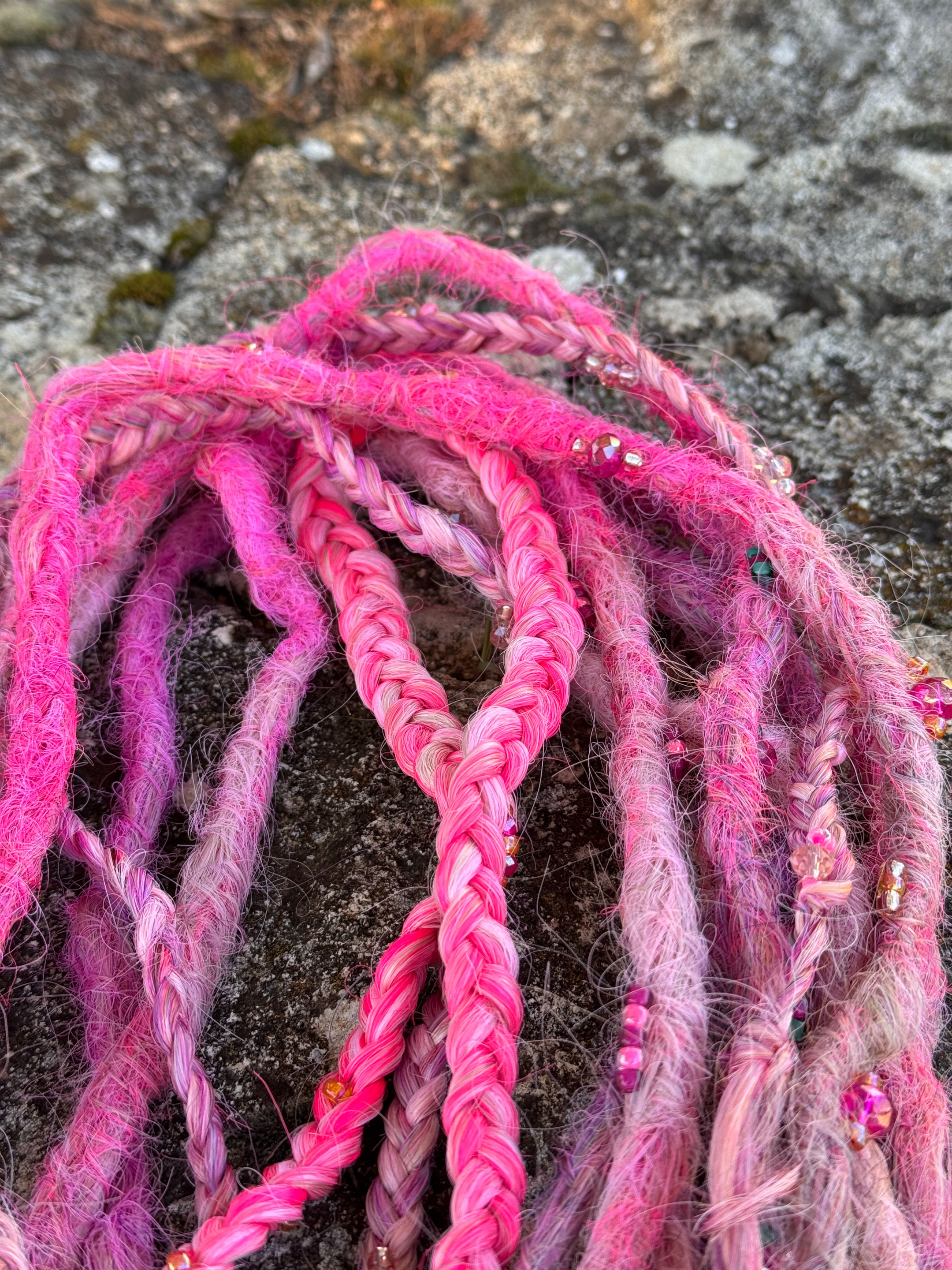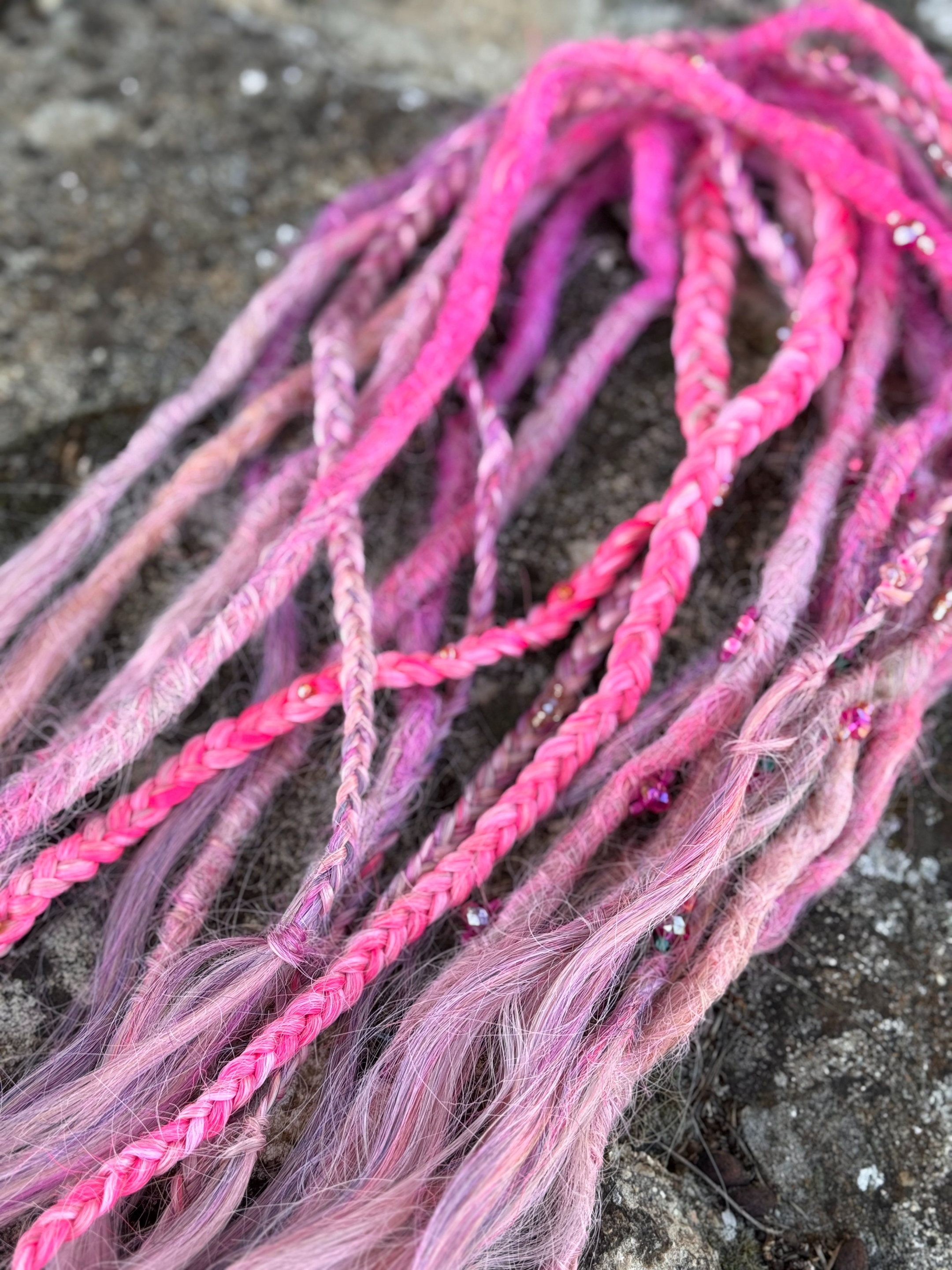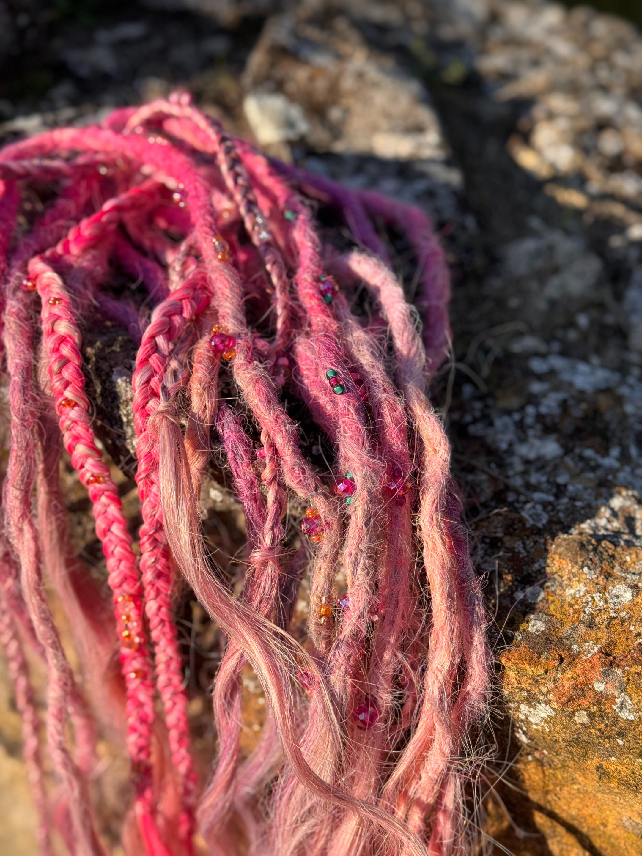 Jag gör bĂ„de pre made dreadlocks som single ended dreads och double ended dreadlocks som man kan flĂ€ta in med olika metoder, du kan vĂ€lja, vilken typ av textur dreadsen ska ha och vilka fĂ€rger och hur du vill att slutet ska vara pĂ„ dreadsen som text dreadlocks med lösa toppar som Ă€ven kallas för Mermaid dreadlocks.Â